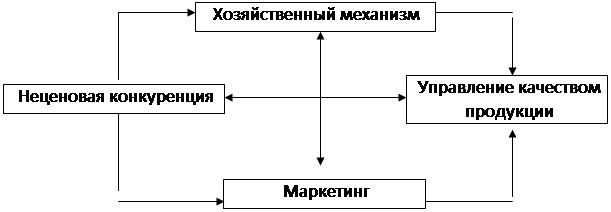 Особенности современного этапа НТР определяют изменения в содержании экономических отношений и хозяйственного механизма. Прежде всего, в сфере конкуренции на первое место выдвигается неценовая конкуренция. Это определяет новое содержание взаимосвязей блока, представленного на рис. 1.2.