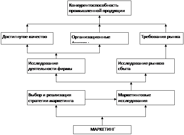 На основе вышеприведенных исследований и анализа показано влияние маркетинга на факторы, от которых зависит конкурентоспособность продукции, которое можно представить в виде схемы (рис. 2.4.).