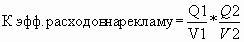 Где: Ia - индекс роста товарооборота в магазине а, в котором реклама не проводилась; Ib - индекс роста товарооборота в магазине b, в котором проводилась реклама; E - эффект от рекламы, рекламная прибыль; T1а - товарооборот в период, когда реклама не проводилась в магазине а; T2а - товарооборот в период, когда реклама проводилась, в магазине а; T1b - товарооборот в период, когда реклама не проводилась в магазине b; T2b - товарооборот в период, когда реклама проводилась, в магазине b; P - процент наценки на товары, A - расходы на рекламу.