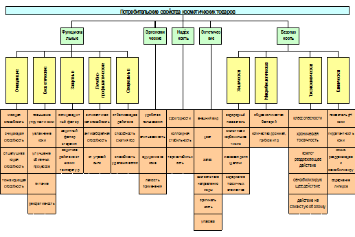 Косметические товары придают красивый внешний вид и здоровое состояние коже и волосам и поэтому имеют большое гигиеническое, эстетическое и психологическое значение. Они очищают, увлажняют, питают, укрепляют, защищают от неблагоприятных факторов природы, устраняют воспалительные процессы. Потребительские свойства косметических средств в целом можно разделить на следующие основные группы: