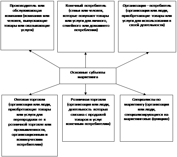 Субъекты маркетинга включают производителей и организации обслуживания, оптовые и розничные торговые организации, специалистов по маркетингу и различных потребителей.