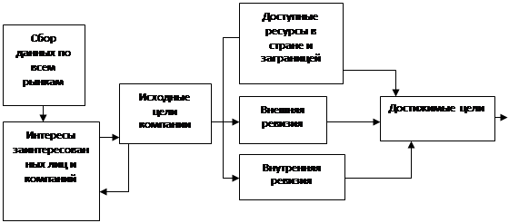 Исходные цели пропускают через тройной фильтр: доступные ресурсы в стране и за границей, состояние окружающей среды (внешняя ревизия), а также внутренние возможности и результаты деятельности компании.