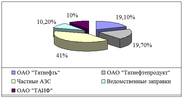 Необходимо отметить, что емкость татарстанского рынка бензина составляет 1,1 млн. тонн бензина и 1,2 млн. тонн дизельного топлива в год. Бензин в Татарстан поставляется из Уфы, Самары и Перми. Крупнейшими топливными операторами являются ОАО «Татнефть» (153 АЗС, 19,1% рынка) и ОАО «Татнефтепродукт» (159 АЗС, 19,7% рынка). 41% рынка приходится на частные АЗС (356 шт.), чуть более 20% рынка занимают ведомственные заправки (рис. 1.1.) [6].
