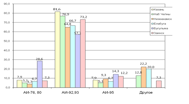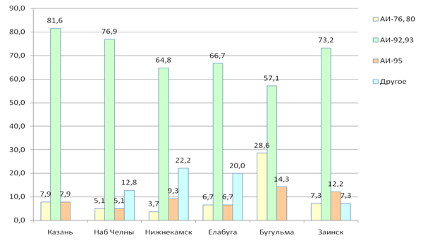 В свою очередь, бензин марки АИ-92,93 пользуется наибольшим спросом у респондентов: в Казани –81,6%, в Набережных Челнах – 76,9%, в Нижнекамске – 64,8%, в Елабуге – 66,7%, в Бугульме – 57,1% и в Заинске – 73,2%. Такая структура потребления связана с тем фактором, что среди опрошенных были владельцы частных легковых автомобилей. Распределение по предпочтениям марок бензина представлено на рисунке 2.11 и 2.12.