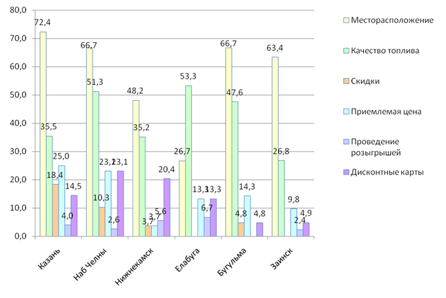 Такой критерий как «месторасположение» является ключевым при выборе АЗС «Автодорстрой»: в Казани –72,4%, в Набережных Челнах – 66,7%, в Нижнекамске – 48,2%, в Елабуге – 26,7%, в Бугульме – 66,7% и в Заинске – 63,4% .