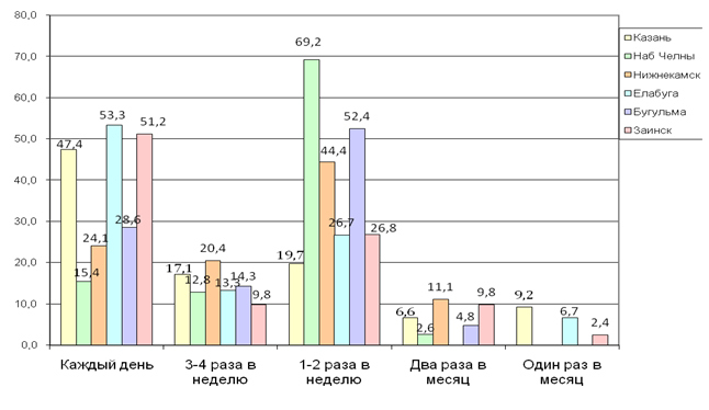 . Как показали результаты исследования, у большей половины опрошенных в г. Казань (59,2%), в г. Набережные Челны (64,1%), в г. Нижнекамск (64,8%), и в г. Бугульма (57,1%) объем потребления ГСМ меняется в зависимости от сезона. А в г. Елабуга 26,7%, и в г. Заинске 63,4% данный показатель чуть ниже половины: 46,7% и 48,8 соответственно.