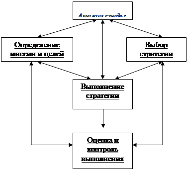 Стратегическое управление можно рассматривать как динамическую совокупность пяти взаимосвязанных управленческих вопросов. Эти процессы логически вытекают один из другого. Однако существует устойчивая обратная связь и, соответственно обратное влияние каждого процесса на остальные и на всю их совокупность. Это является важной особенностью системы стратегического управления. Схематически структура стратегического управления изображена на рис. 1.